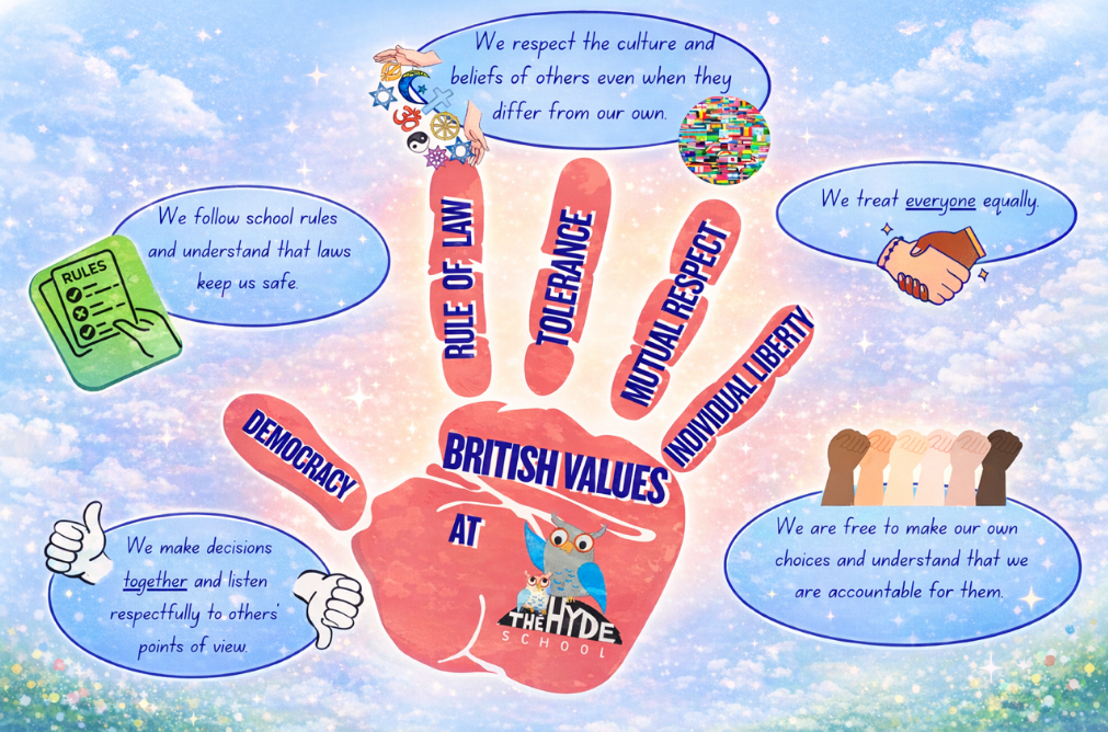 At The Hyde, we aim to actively promote British values in our school in accordance with The Department for Education, to ensure young people leave school prepared for life in modern Britain. Our children and families are encouraged to regard people of all faiths, races and cultures with respect and tolerance and understand that while different people may hold different views about what is ‘right’ and ‘wrong’, all people living in England are subject to its law. We respectfully challenge pupils, staff, visitors or parents who express opinions contrary to British values.